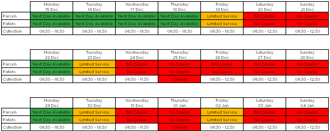 Deliveries as usual, but please be aware as we use a 3rd party courier, these couriers will become busier as the festive season continues. So we urge you to order before Thursday 11th December for delivery before the Christmas and New Year period.